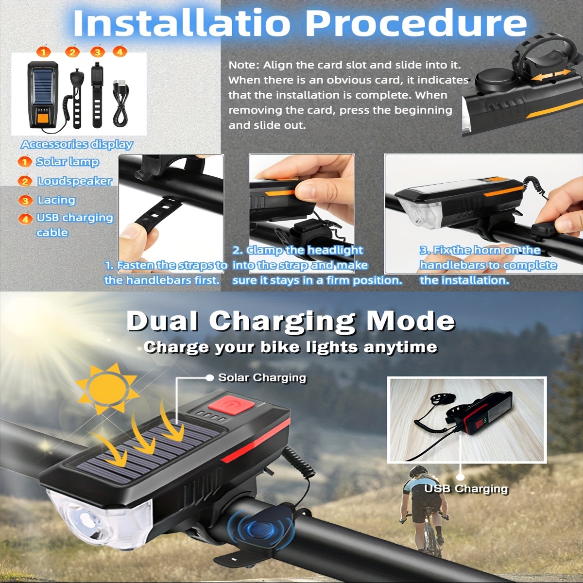 20 reviews for 1pc Solar Powered Bicycle Horn Light With Power Indicator, T6 Bright LED Front Light, USB Rechargeable, High-Decibel Horn, Multiple Light Modes (350/200 Lumens)