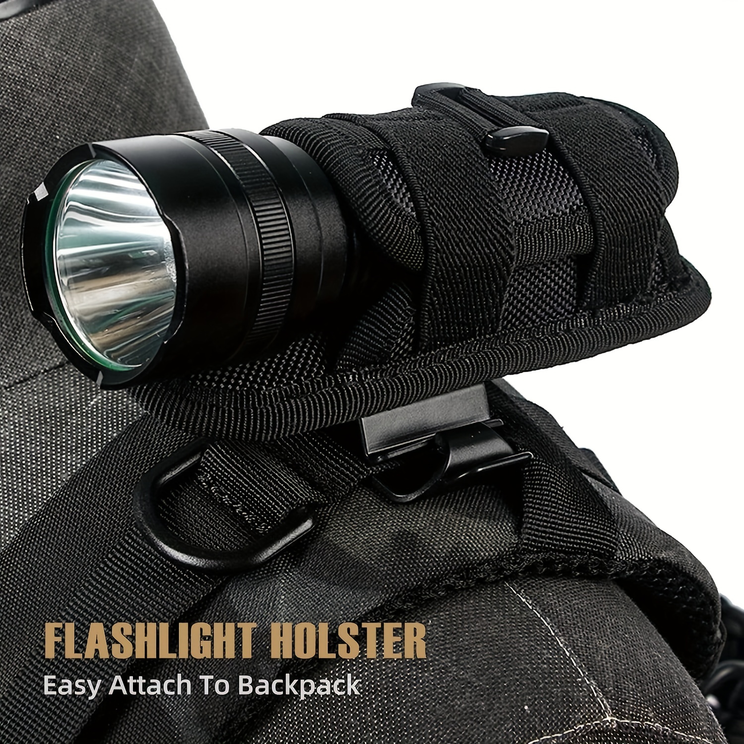 1/2pcs Tactical Flashlight Pouch Holster (with 360° Rotatable Belt Clip), Mobile Flashlight Holder installed on shoulders, thighs, arms, and waist.